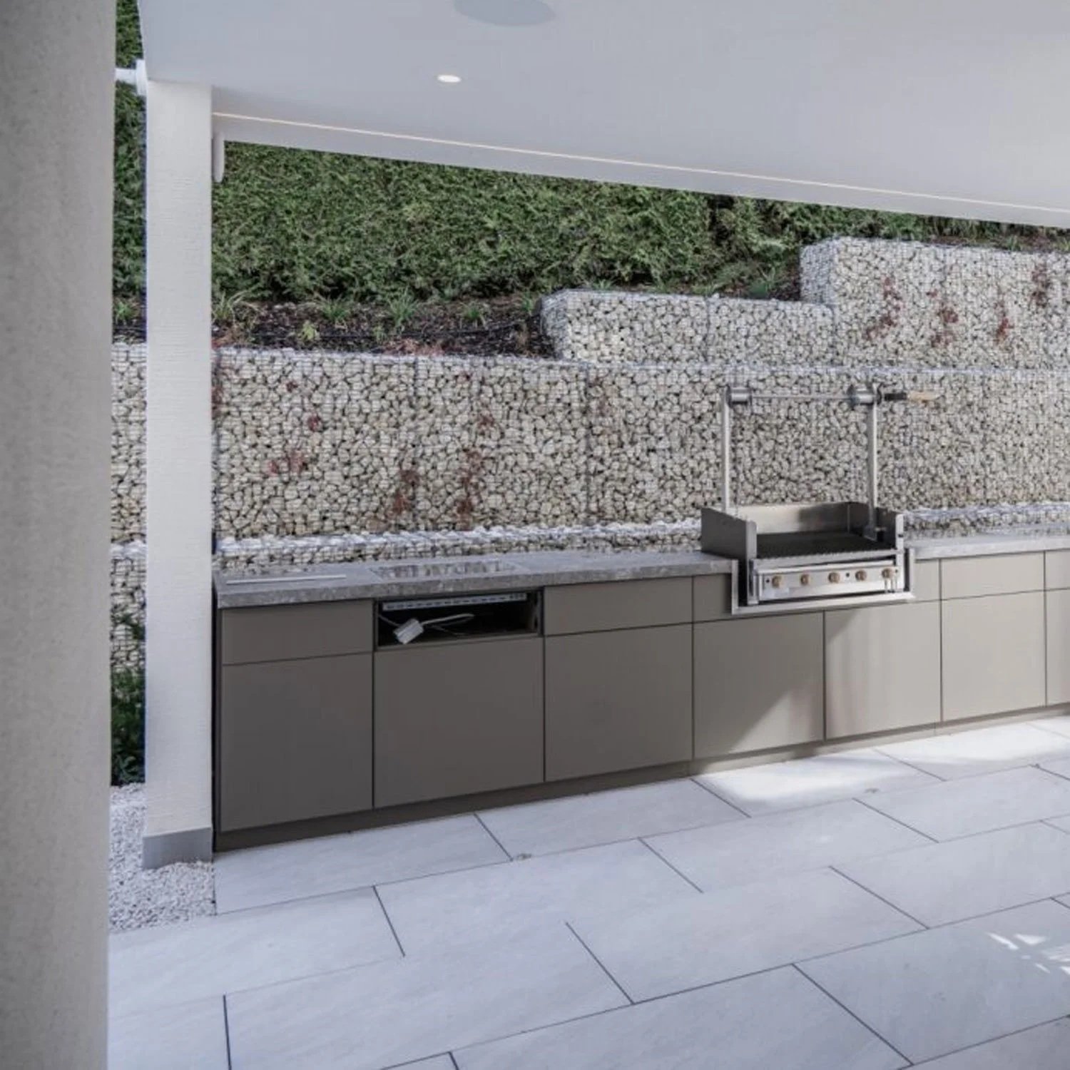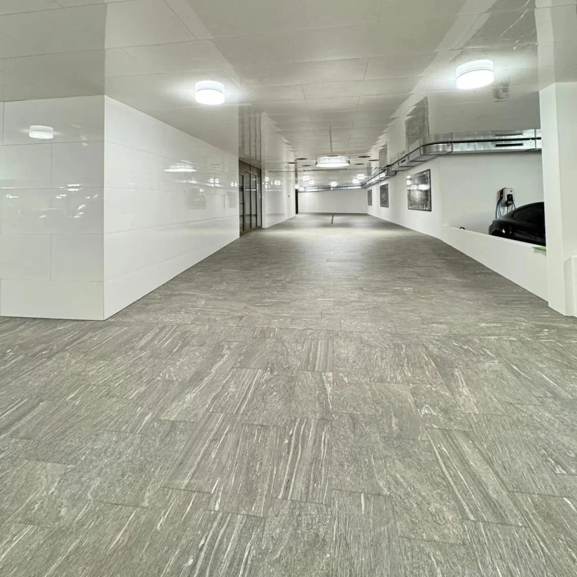 Auf einer Grossbaustelle in Wilen bei Wollerau wurden rund 7500 m² Feinsteinzeugplatten im Format 30x60 cm in einer doppelstöckigen Tiefgarage verlegt. Die Parkplatzbegrenzungen wurden mit Spezialplatten ausgeführt.