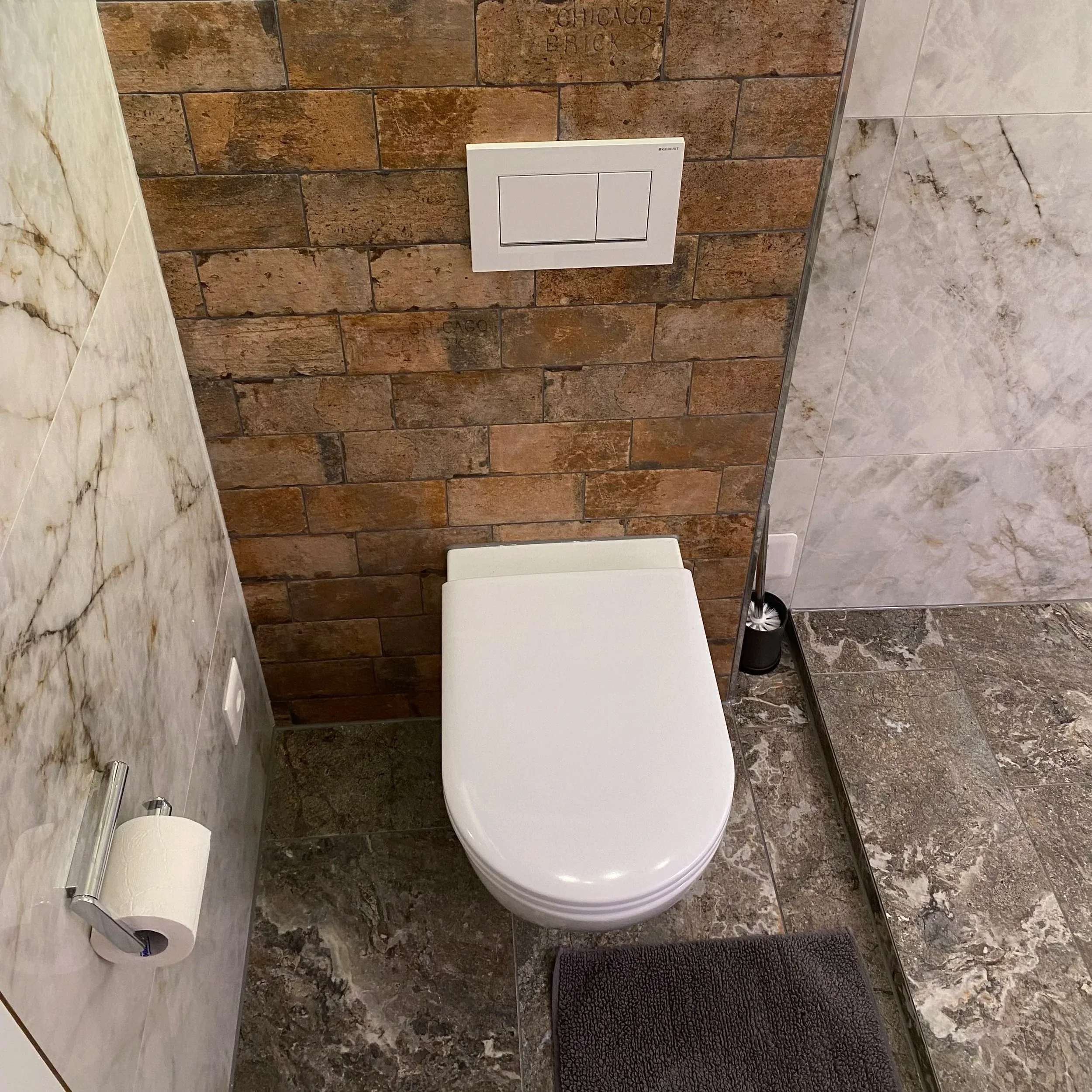 Beim Umbau eines Einfamilienhauses in Galgenen wurden drei Nasszellen komplett erneuert. Nach den Abbrucharbeiten der bestehenden Beläge kamen Feinsteinzeugplatten im Format 60x120 cm und 30x60 cm zum Einsatz. Zusätzlich wurden Dekowände aus Skinrock im Format 120x250 cm eingebaut.