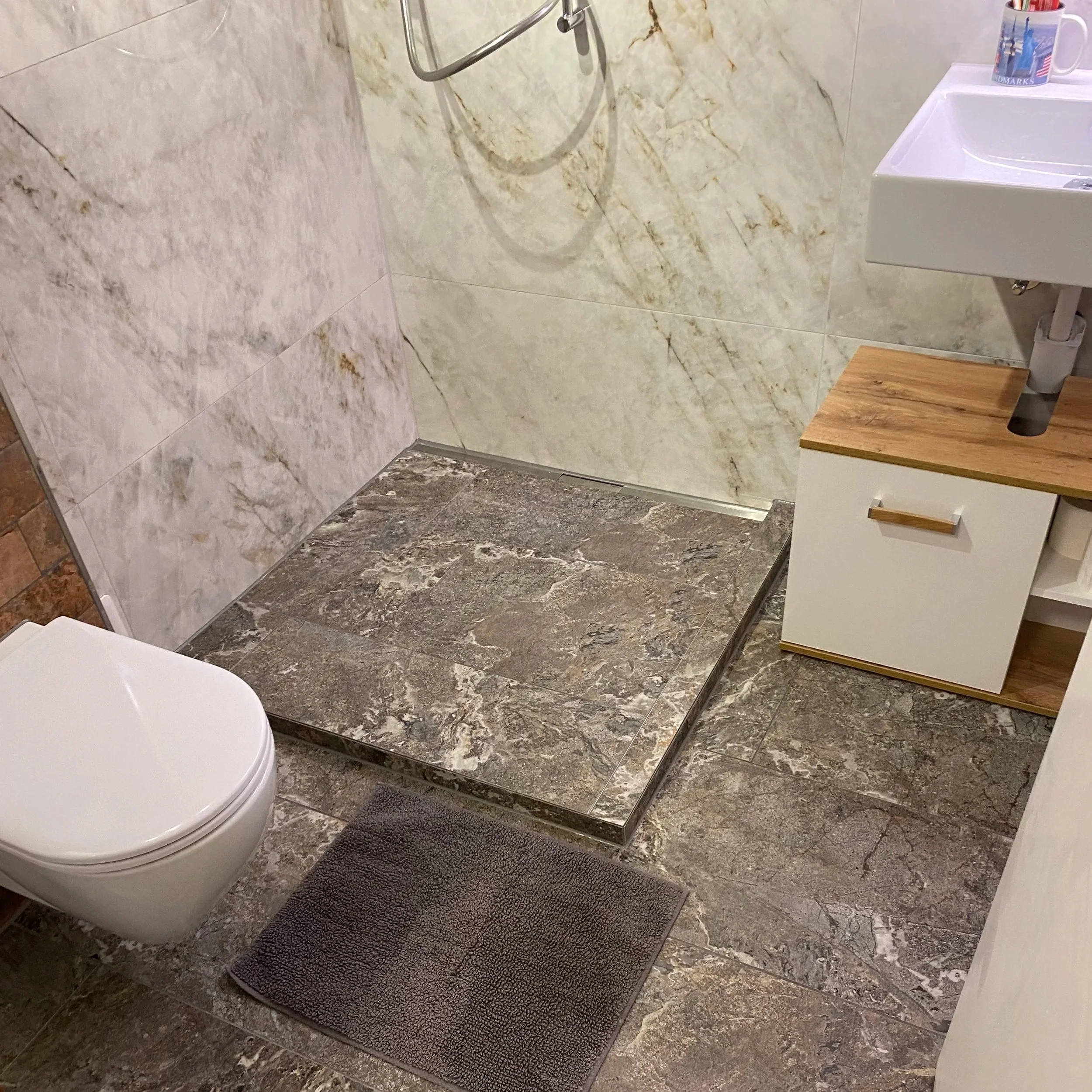 In einem bewohnten Einfamilienhaus in Galgenen wurde ein bestehendes Badezimmer umfassend erneuert. Nach dem Entfernen der alten Plattenbeläge und der Badewanne wurde eine begehbare Dusche realisiert. Verlegt wurden moderne Feinsteinzeugplatten im Format 30x60 cm.